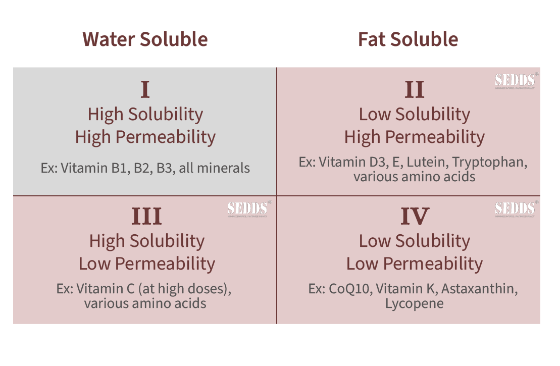 For example, Vitamin E bioavailability has been widely studied and research shows that Vitamin E absorption rates ranges between 10%-79%, depending on a variety of dietary factors including food matrix, fat, and fat-soluble micronutrients. With the application of SEDDS®, absorption rates are expected to improve significantly and with greater consistency. In clinical studies of actives with similar molecular structures, we’ve seen absorption rates improve 3x using SEDDS® technology.